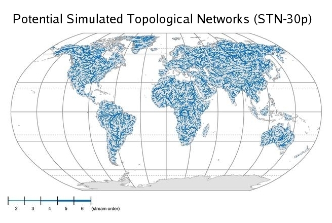 Simulated Topological Networks are used to represent the linkage of continental land mass and river networks in the Global Hydrologic Archive and Analysis System (GHAAS). STN networks are generated at various resolutions. The 30-minute STN for the world (shown above) is suitable for monthly flow simulations, such as used in the GHAAS Water Transport Model (WTM). Other uses of the STN include the derivation of basin-wide or subbasin characteristics such as stream order, mainstem length and catchment area.